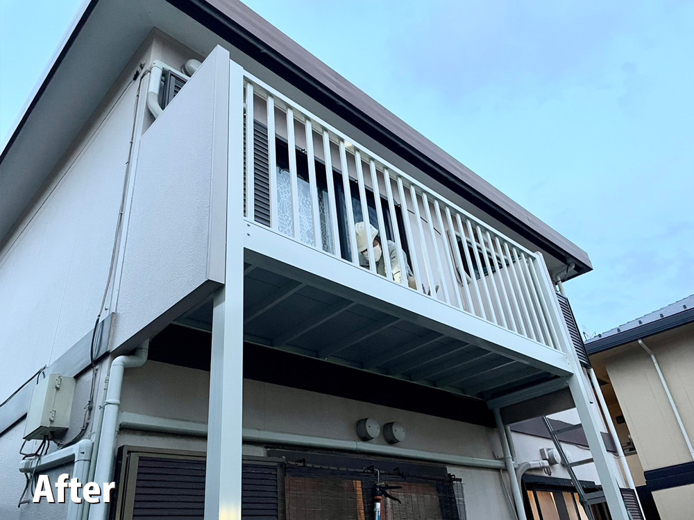 【施工事例】バルコニー交換工事 Posted on 2024年9月16日2024年9月16日 by shonanlongshamada 既存のバルコニーがサビ等で劣化して危険な状態だった為、交換工事を行いました。 両側の袖壁内にキッチリ収まり違和感なく仕上がりました。 お客様にら事前に鉢植えの移動等ご協力を頂き、解体から設置まで1日で終わらせる事ができました。 ビフォー リフォーム作業工程 アフター お問い合わせ 私たち湘南ロングスは小さな住まいお悩みから、大きな住まいのお悩みまで、一人一人のお客様の住まいのお悩みを解決いたします。 また、工事を半年後、来年以降でお考えの方や、近い将来の計画のご相談だけでも構いません。 また、住宅管理に関する事もお気軽にお問合せ下さい。 お見積もり、ご相談は無料です。 Posted in 施工事例.