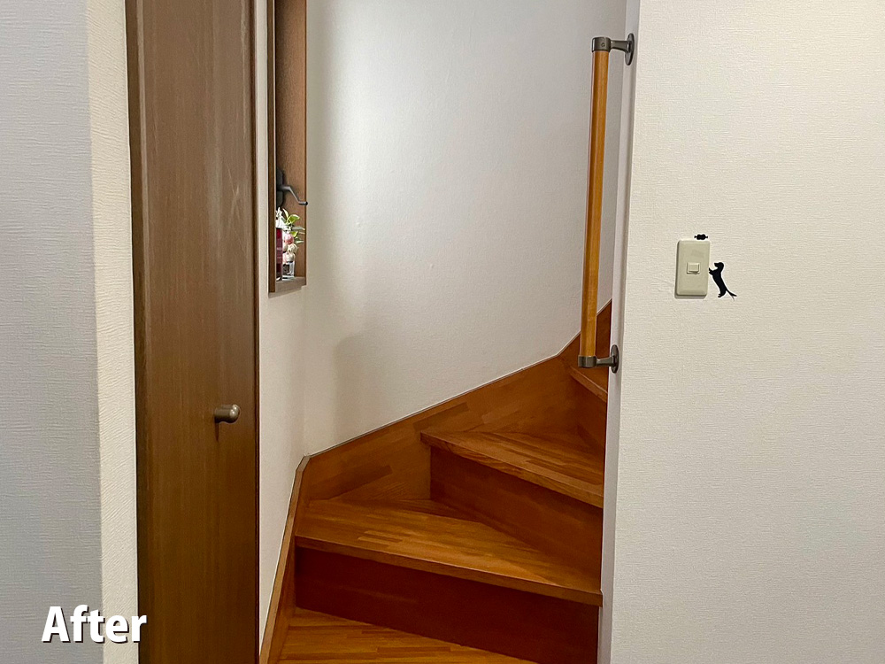【施工事例】階段手すり設置工事 Posted on 2024年8月26日2024年8月26日 by shonanlongshamada 元々手すりが設置されていなかった為、転落防止と昇降の動作が楽になるように手すりを設置しました。 手すりの高さ等、ご使用される方が使いやすい高さに調整して取り付けしました。 ビフォー アフター お問い合わせ 私たち湘南ロングスは小さな住まいお悩みから、大きな住まいのお悩みまで、一人一人のお客様の住まいのお悩みを解決いたします。 また、工事を半年後、来年以降でお考えの方や、近い将来の計画のご相談だけでも構いません。 また、住宅管理に関する事もお気軽にお問合せ下さい。 お見積もり、ご相談は無料です。
